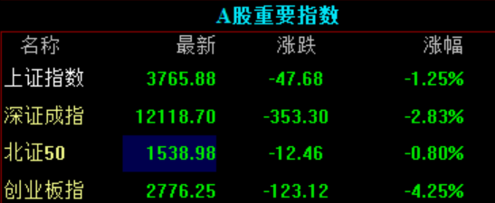 9月4日,三大股指集体收跌,上证指数报收3765.88点,跌1.25%;深成指报收12118.7点,跌2.83%;创业板指报收2776.25点,跌4.25%;科创50指数跌超6%。沪深两市全天成交额2.54万亿,全市场近3000只个股下跌,超2200只个股上涨。