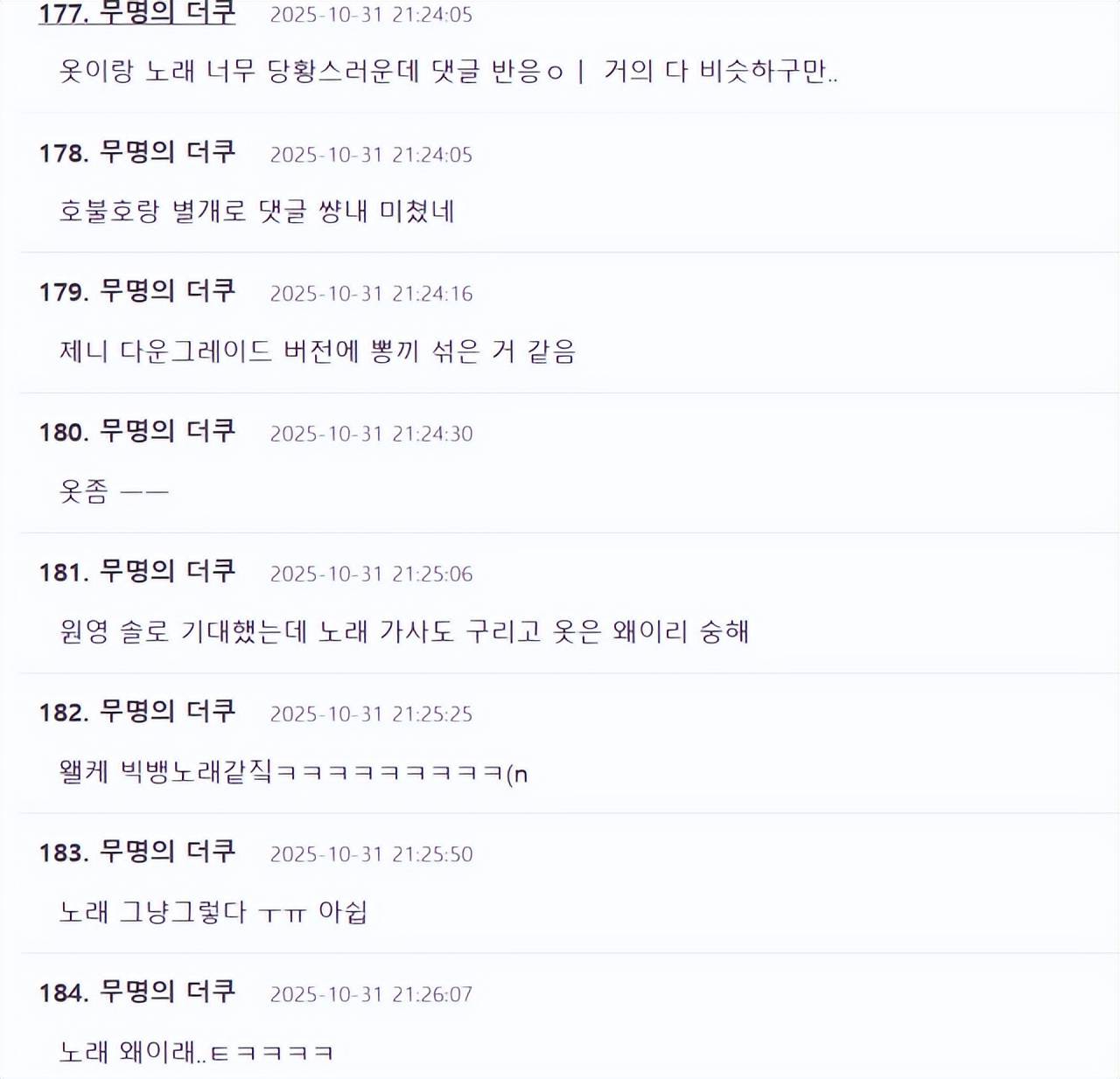 众多听众从专业角度对这首自创曲发起了猛烈抨击。网友们毫不留情地评价道:“这身造型和歌曲都令人困惑...评论区似乎都在表达相同观点。”有人直言歌曲质量不佳:“本来非常期待张元英的solo,但歌词质量堪忧。”更有乐评人将其形容为“像是《LIKE》Jennie版本的降级混搭风,还掺了些演歌元素”,甚至有人感觉“为什么听起来像BIGBANG的风格”。总结网友对歌曲的直接感受,就是“歌曲表现平平哈哈,太遗憾了。”以及“这曲子怎么回事..呵呵呵。”