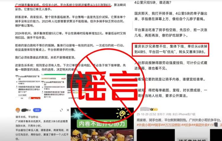 美团方面称,最早从10月3日开始,网上就出现类似内容的传播。最早的说法是“重庆长沙兄弟憋不住,集体下线,今天不发声,明天5块变3块。”此后逐步演变成:“广州骑手集体关机那天,系统把3块5的送餐费涨到6块,只用了半小时”“2024年杭州兄弟拒接5元单,平台高峰涨两块,说明只要大家同时关机,算法就得低头”等博眼球的文案。