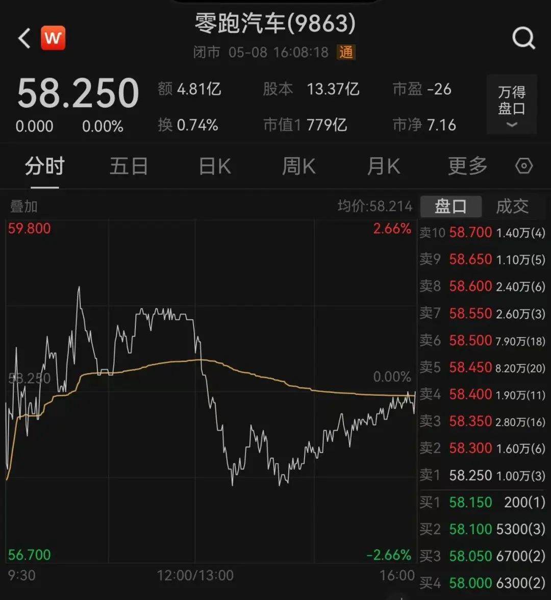 二级市场上,5月8日,零跑汽车股价先是上涨后转跌,收盘时再次上涨,最终收盘价与昨日持平,最新股价为58.25港元,总市值为779亿港元。